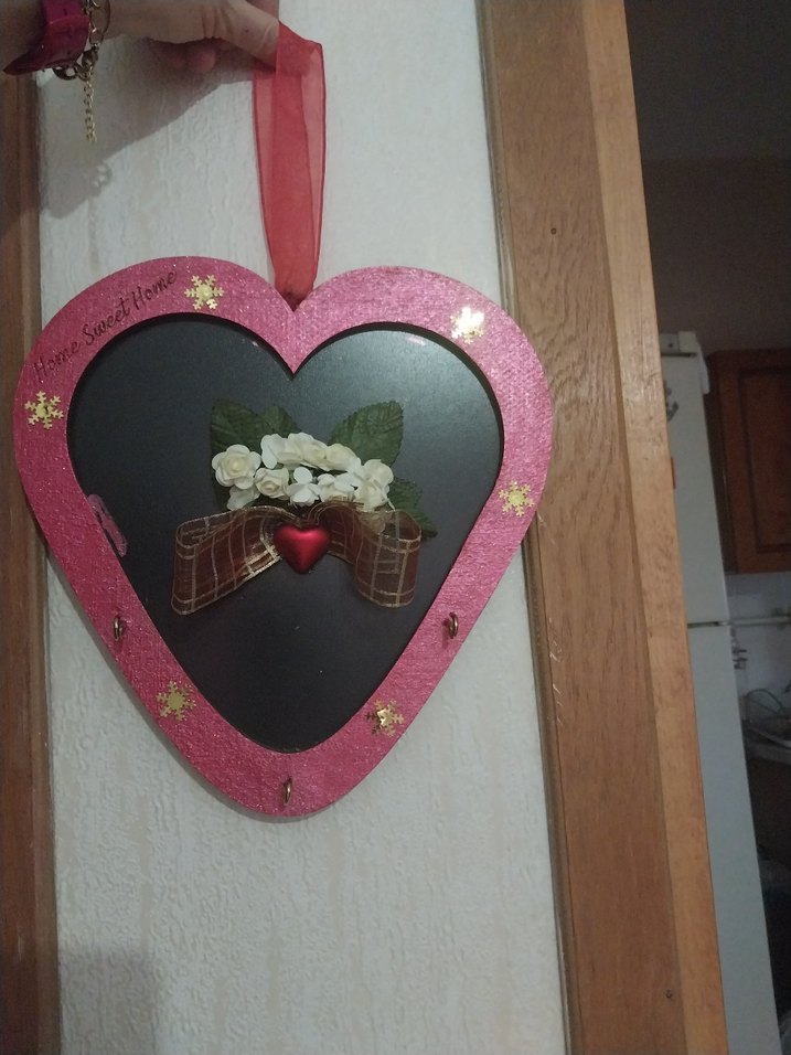 Çiçek ve kurdele detaylı, askı kurdelalı, kancalı koyu pembe kalp şeklinde duvar dekoru.