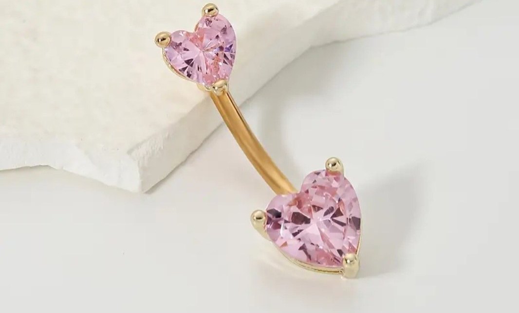 Kadınlar için pembe kalp taşlı, altın renkli kıvrımlı göbek piercingi, pastel ışıltısıyla cesur ve çağdaş bir tarz sunar.