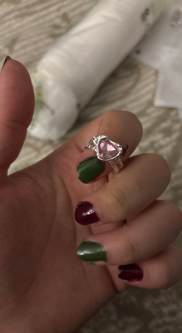 Pembe kalp taşlı, pullu detaylı kadın yüzük. Romantik akşamlar için bohem ve göz alıcı bir tasarım. marka yok