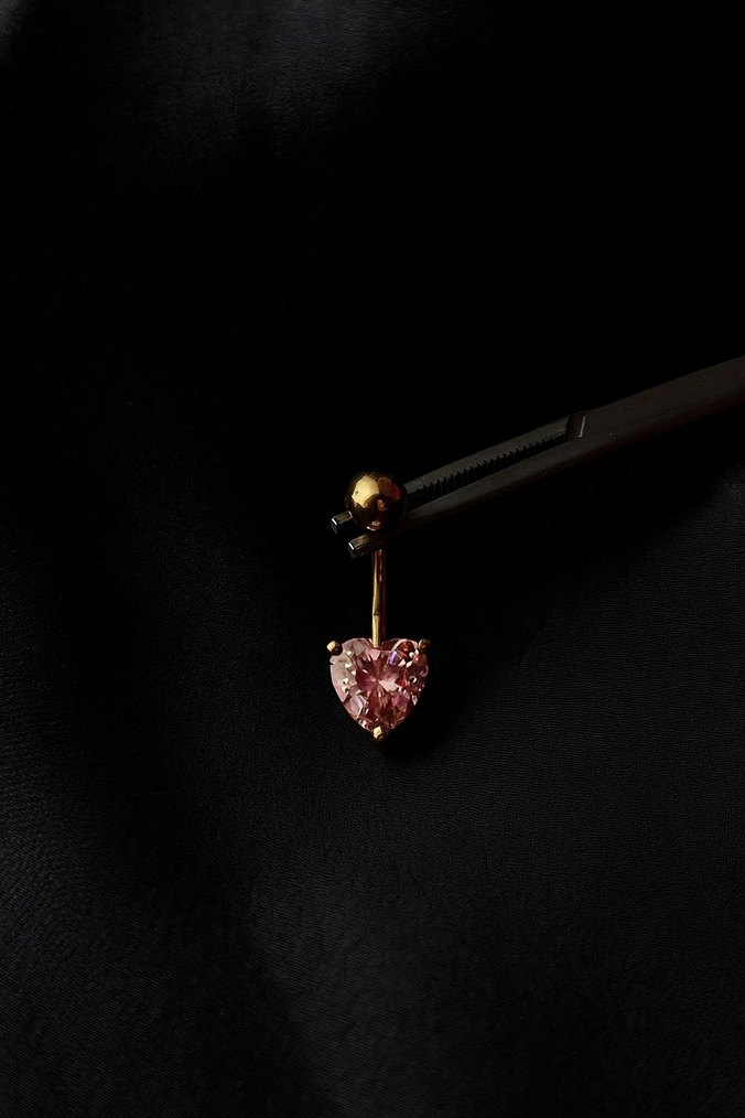 Koyu pembe kalp şeklinde, seketli taşlı, cesur ve gotik tarzda kadın piercingi.