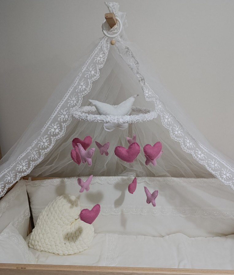 Pembe kalp ve kelebeklerin asılı olduğu beşik süsü, dantel tül tente ile tamamlanmış. Bebek odasına yumuşak ve huzurlu bir hava katıyor. İstenilen renk ve modelde yapılır. Sıfır ürün. Tamamen el emeğidir. Marka temsilidir.