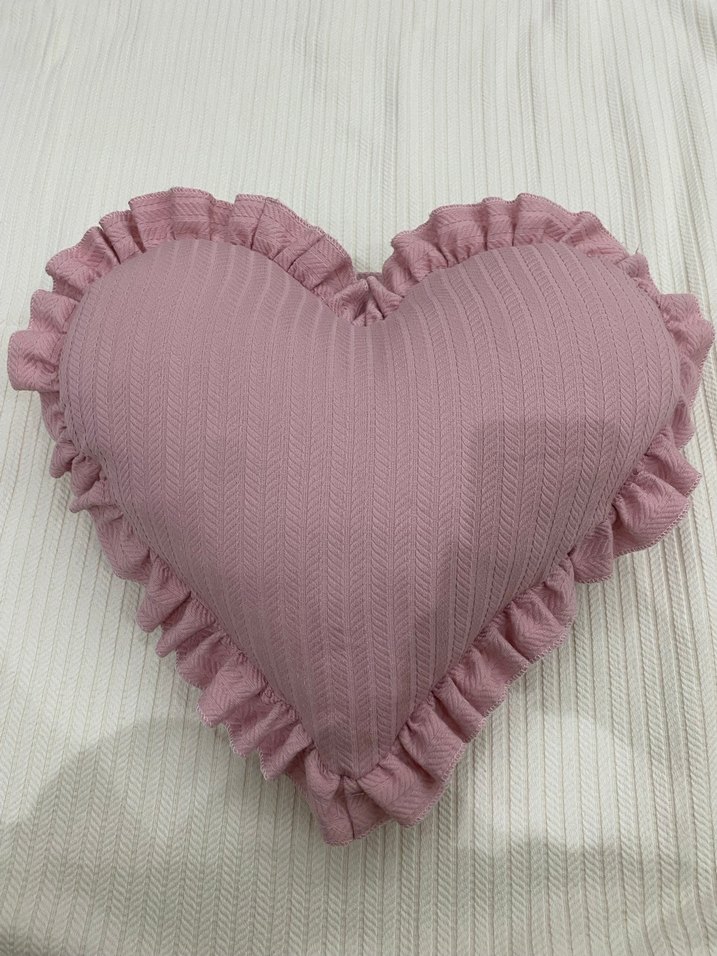 fırfırlı kenarlara sahip pastel pembe kalp şeklinde yumuşak dekoratif yastık. (Kişiye özel üzerine isim yazılır)