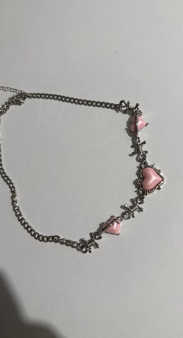 pastel pembe kalp detaylı zincirli normal uzunlukta midi kolye. Romantik akşamlar için rock punk havası taşır.