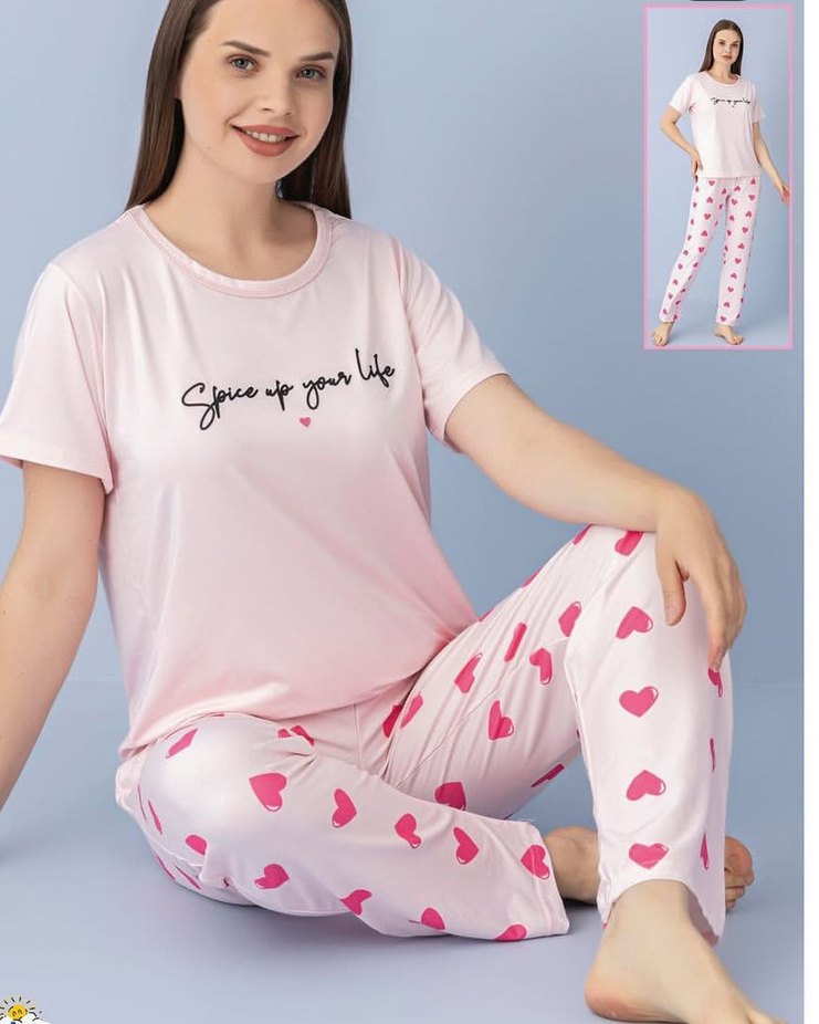 Pembe pastel renkte,kısa kollu kadın pijama takımı. Üstte yazılı baskı, alt pantolonda kalp deseni bulunur. Rahat ve konforlu. esnek penye kumaştan S/M/L/XL/XXL bedenler mevcuttur