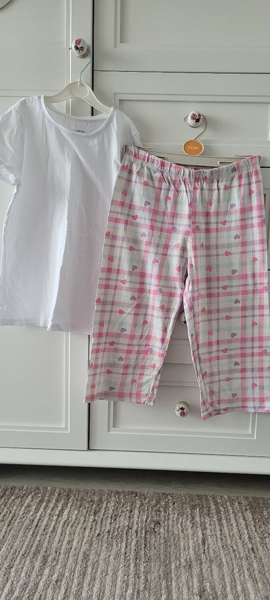 Kız çocukları için rahat kesim beyaz kısa kollu üst ve pembe kalpli kare desenli kaprili set. Rahat ve konforlu kullanım sağlar. Sorunsuz.
