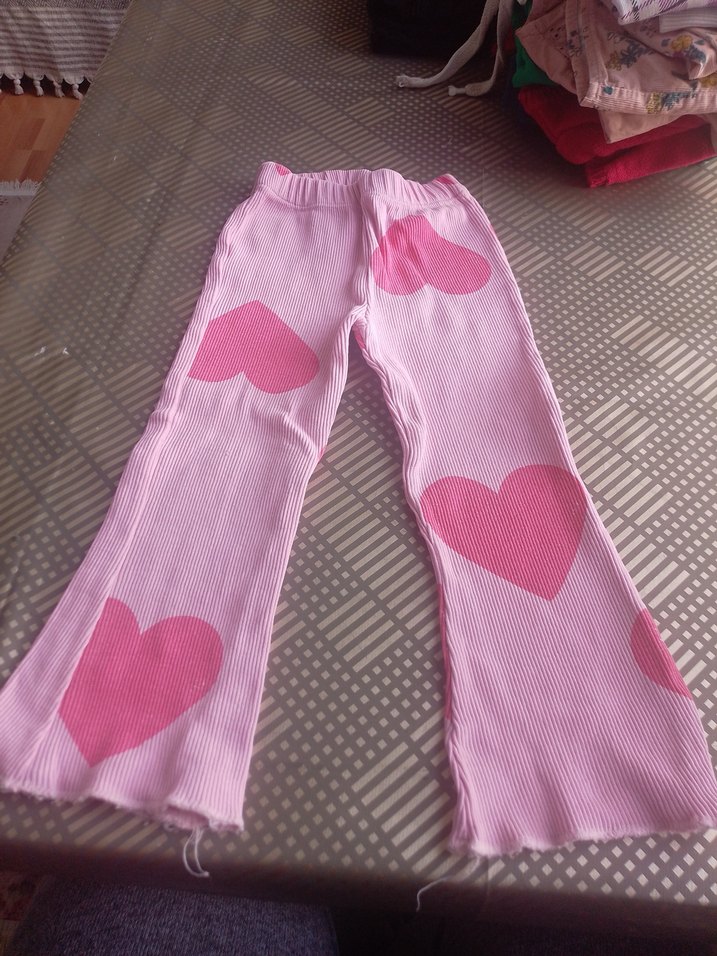 Pembe, bol kesim pantolon, pilili detaylı, pastel tonlarda kalp desenleriyle trendy ve rahat bir model.