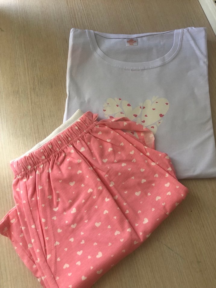 Kadınlar için kısa kollu ve mini boyda, bol kesim pijama takımı. Pembe alt kısmı küçük beyaz kalplerle desenli, üst kısmı kalp baskılıdır. Rahat ve konforlu. Alırken beden sorunuz m bedenden başlamaktadır