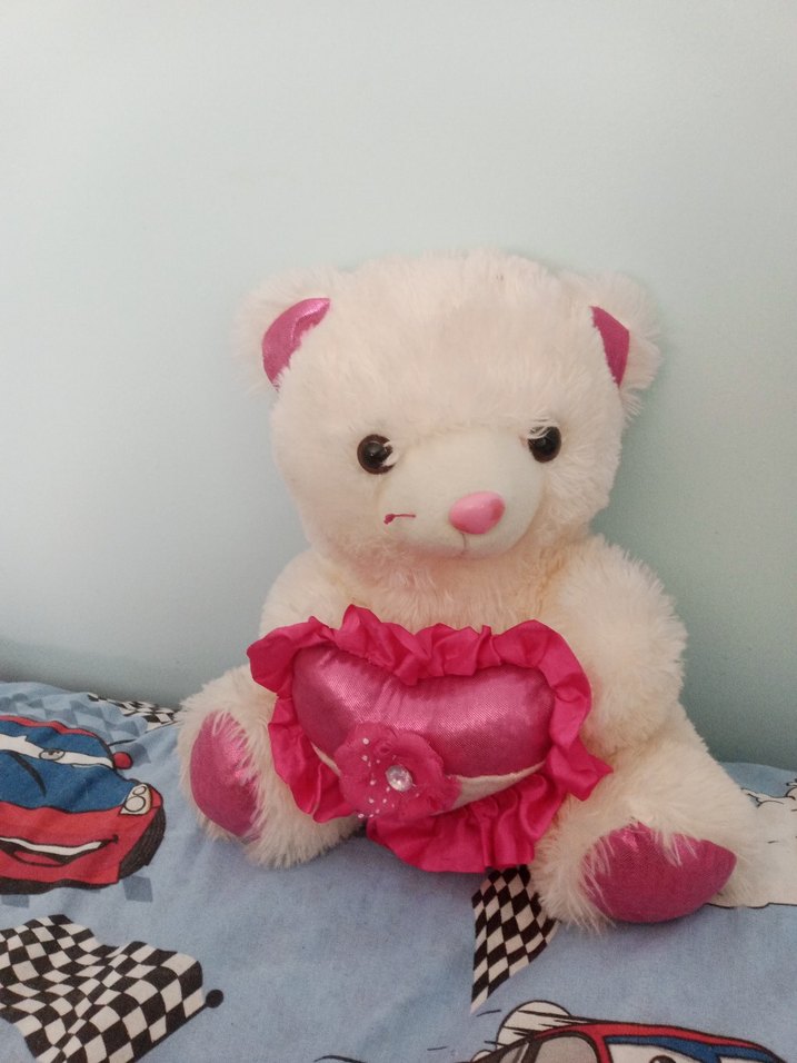 Yumuşak pembe peluş ayıcık, fırfırlı ve küçük çiçek detaylı parlak kalp yastık tutuyor. Sarılmak için uygun. ayicigin elindeki kalpteki krem yerinde tükenmez kalemle M,Ç yazilmis