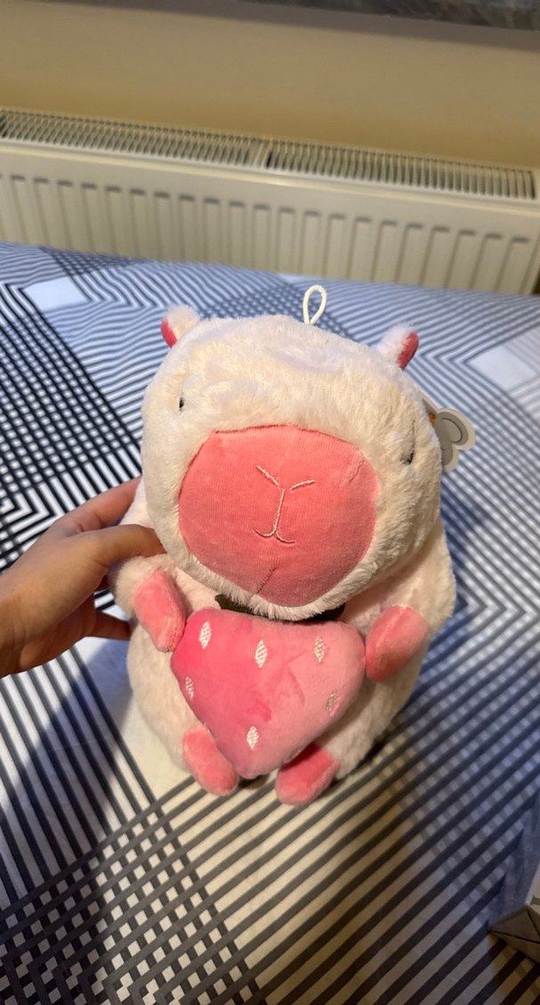 Yaprak desenli kalp yastık tutan yumuşak pastel pembe peluş oyuncak. Yuvarlak sevimli yüzü ve küçük kulakları var.