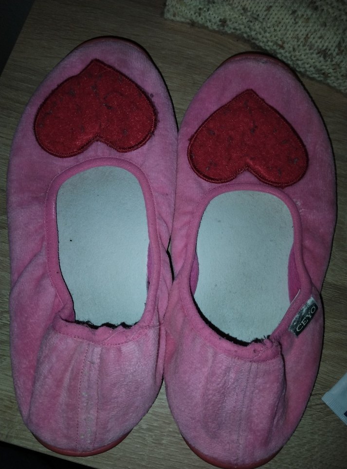 pembe renkli, yumuşak kumaşlı ve cırt cırtlı, kırmızı kalp aplike detaylı sıcak terlikler. Rahat ve şık iç mekan kullanımı için. çorapsız giyildiğinde terleme sonucu o beyaz taban çıkıyor kullanıma engel değildir