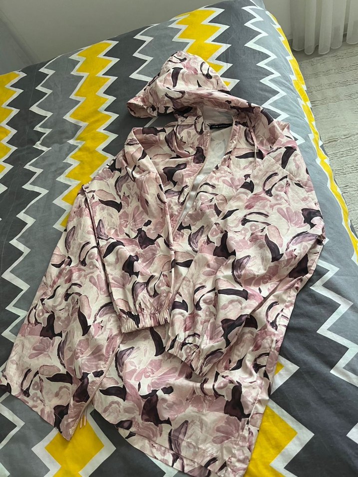 Pembe pastel kamuflaj desenli, kapüşonlu, bol kesim ve uzun kollu kadın ceket. Yumuşak sentetik kumaştan, drapeli tasarıma sahip, günlük ve sokak stili için uygun.