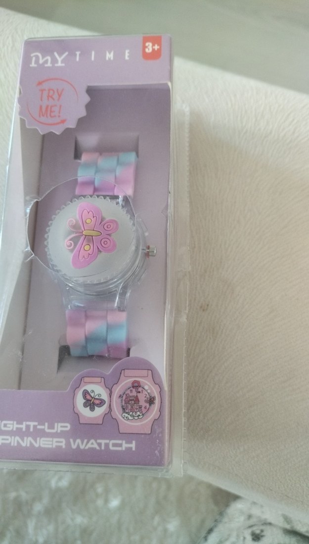 Pembe pastel tonlarında, kelebek baskılı silikonb kadran ve silikon kayışı olan, ışıklı ve döner özelliğe sahip saat.