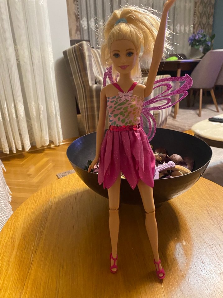 Açık pembe kanatlı peri bebek, çiçek desenli üst ve yaprak şeklinde etekle birlikte. Pembe ayakkabılarla tamamlanmıştır. ♀️