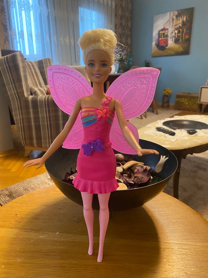 Pembe kanatlı, renkli kıyafetli, çizgili üst ve süslü kemer detayları olan bebek. ♀️