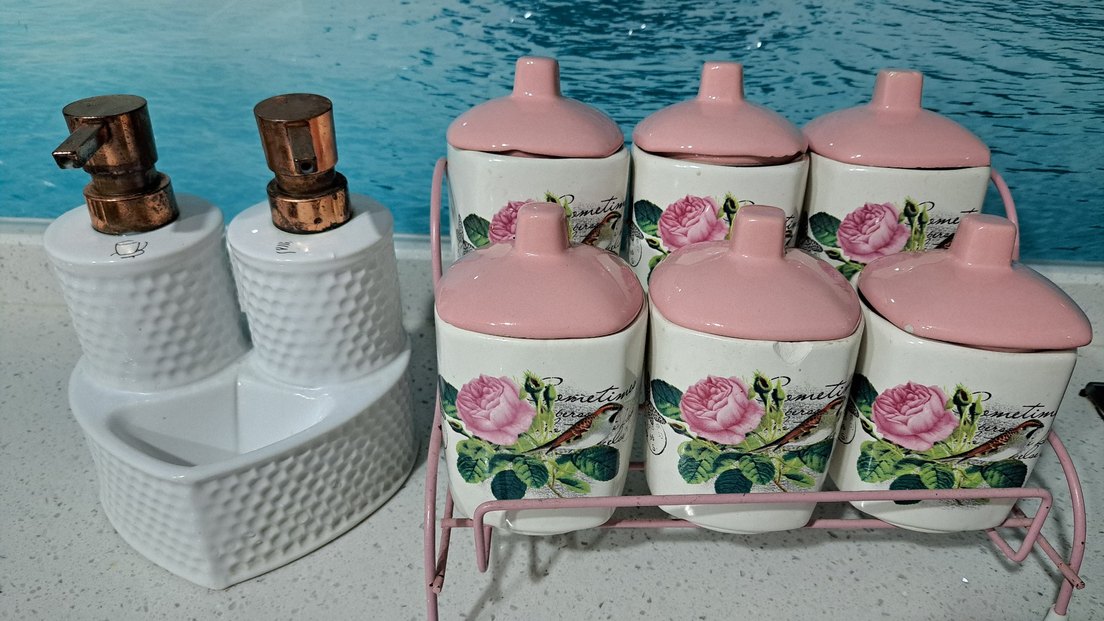 Pembe Kapaklı Çiçek Desenli Mutfak Baharatlık Seti ve sabunluk