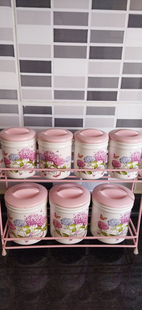 Pembe Kapaklı Çiçek Desenli Mutfak Kavanoz Seti