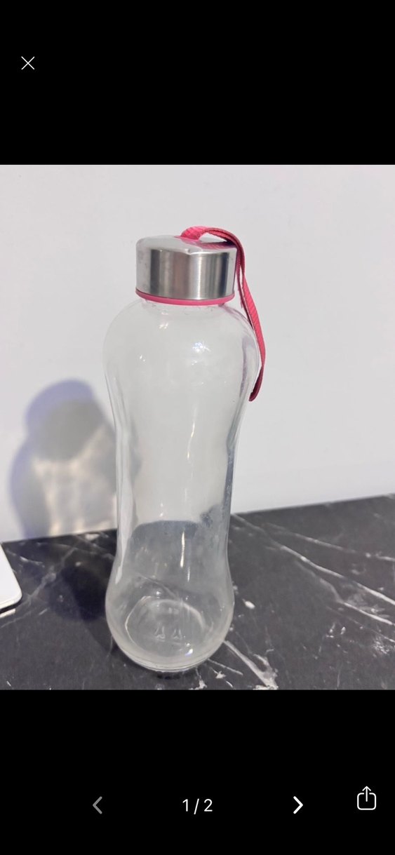 Pembe kapak ve taşıma kayışı olan şeffaf gövdeli, renkli ve kullanışlı matara