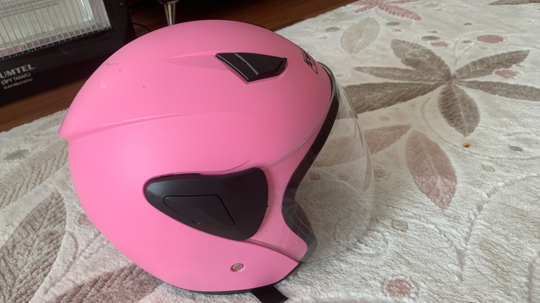 Pembe renkli, kapaklı ve tokalı motosiklet kaskı, şeffaf vizörlü ve düz plastik yüzeye sahiptir. Sokak stiline uygun, temel koruma sağlar. SWAY helmets