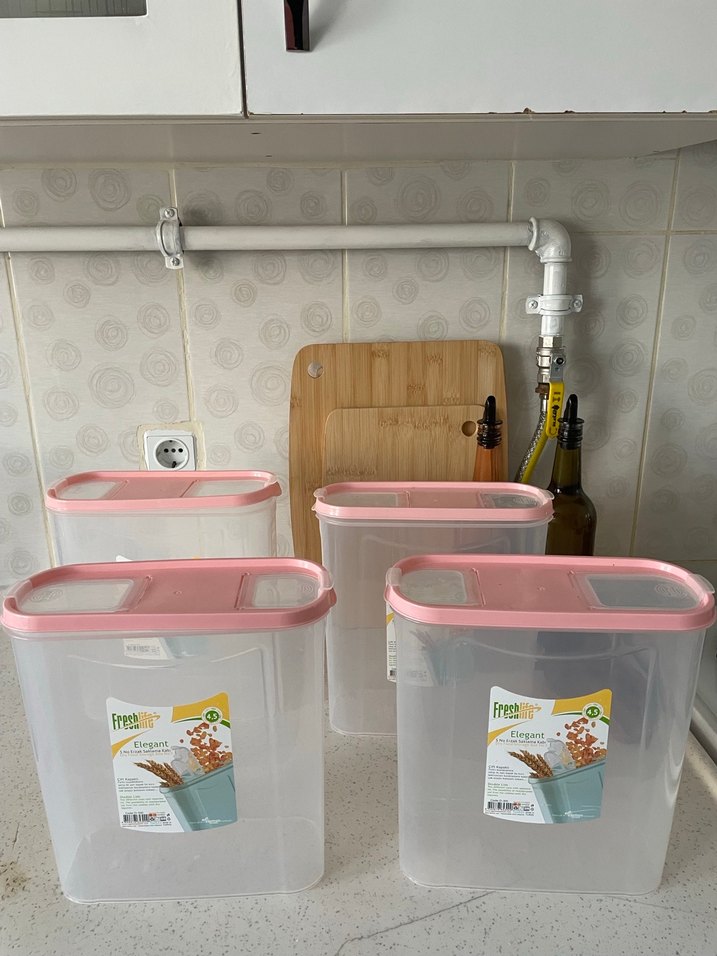 Pastel pembe kapaklı plastik saklama kutuları seti, mutfak eşyalarını düzenlemek için uygun. Dayanıklı ve temizlemesi kolay. ️