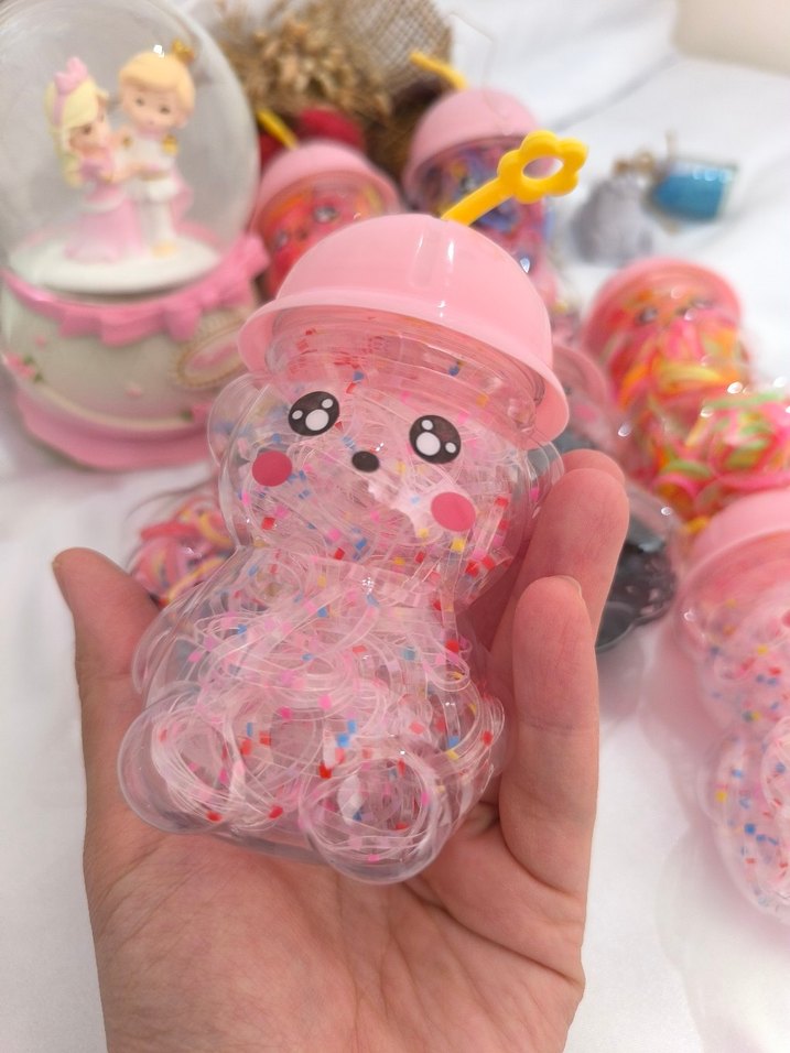 Pembe kapaklı, sarı pipetli ayıcık şeklinde, içinde renkli parçacıklar bulunan şeffaf bebek biberonu.