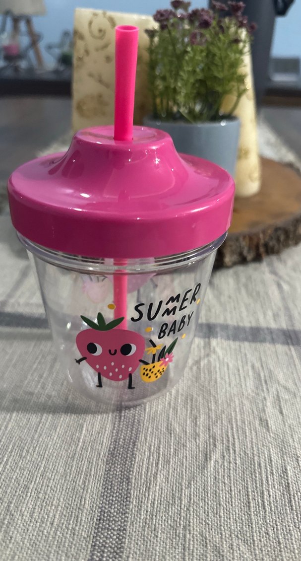 Pembe kapaklı ve pipetli, üzerinde 'SUMER BABY' yazısı ve sevimli meyve figürleri bulunan renkli bebek bardağı. Plastik