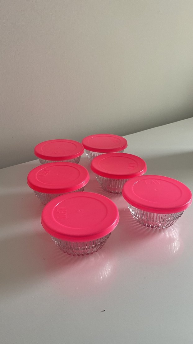 Pembe kapaklı renkli cam saklama kapları, çeşitli yiyeceklerin saklanması için uygundur. Hiç kullanılmamış