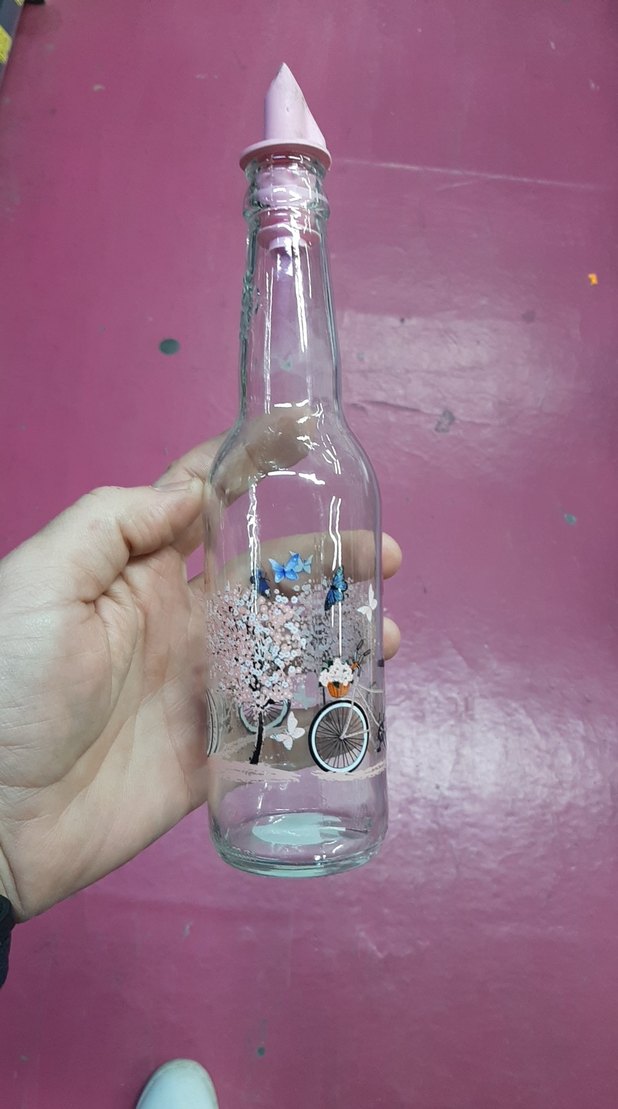 Pembe kapaklı, üzerinde bisiklet ve çiçek desenleri bulunan renkli tasarımlı cam yaglik