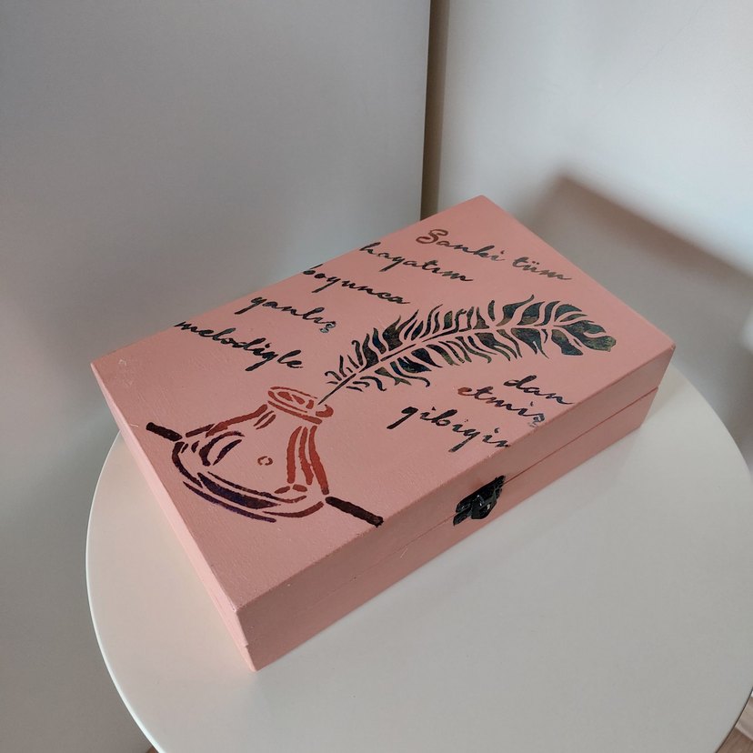 Pembe renkte ahşap kutu, kapağında tüy ve mürekkep tasviri ile el yazısı metinler bulunur. el yapimidir