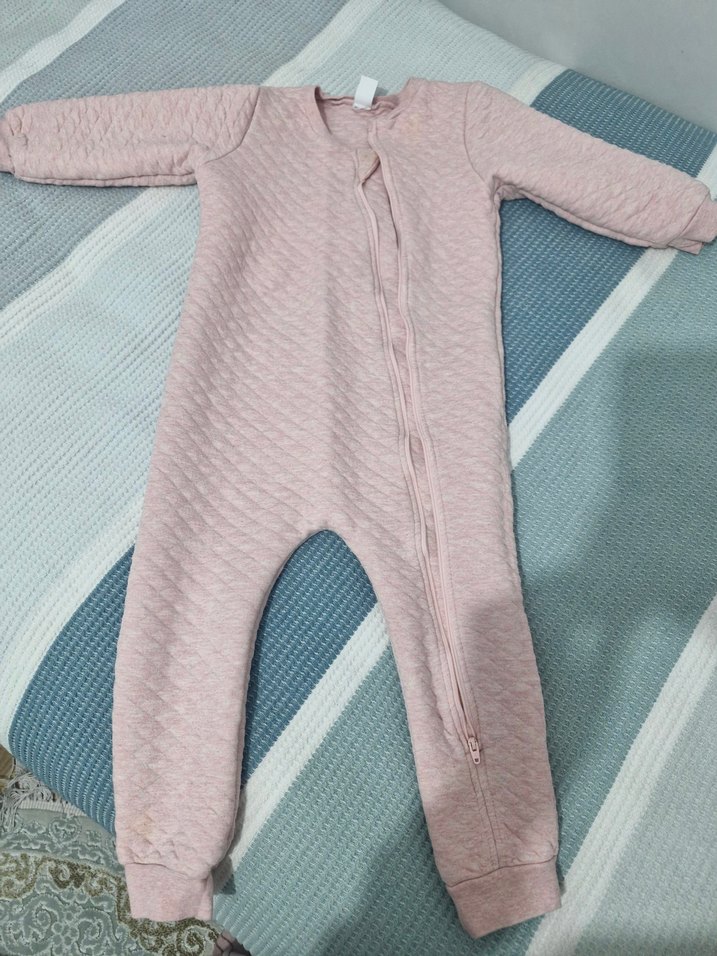 Pastel pembe kapitone kumaştan yapılmış, V yakalı ve fermuarlı kız bebek tulumu, sıcak ve rahat tutar. ❄️