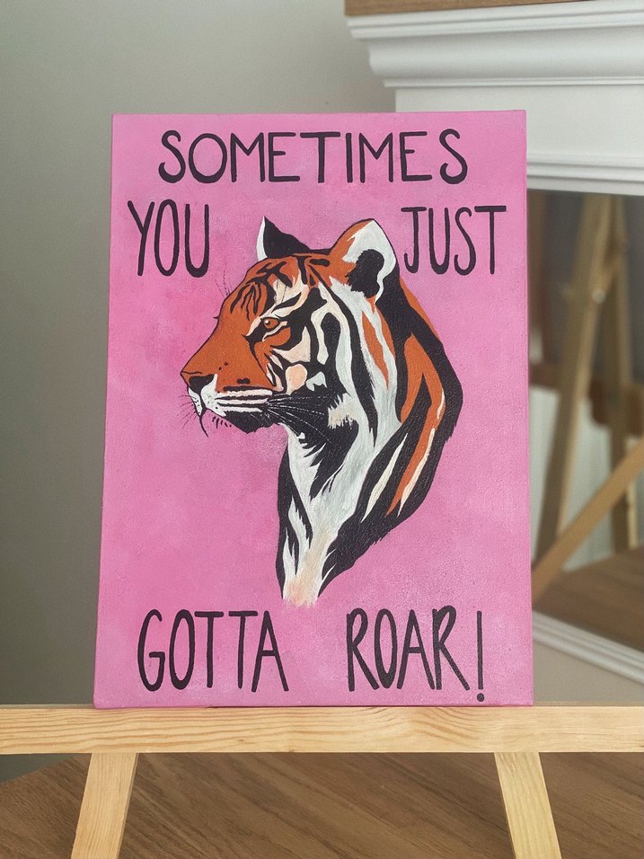 Pastel pembe renkte, kaplan başı ve 'Sometimes you just gotta roar!' yazılı motive edici tablo 25*35 boyutlarında tuval üzerine akrilik boyadır