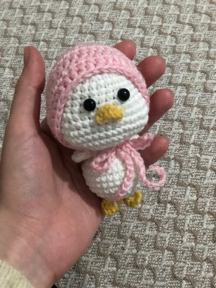 Pembe kapşonlu, sarı gagalı ve ayaklı renkli örgü peluş oyuncak. Yumuşak ve el yapımı, koleksiyon için uygun.