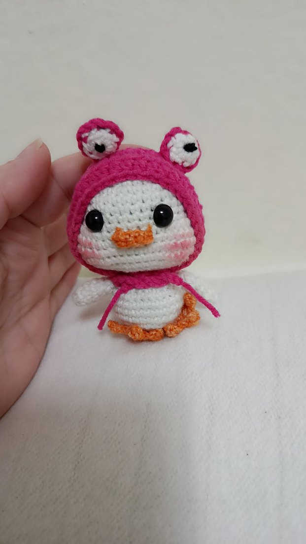 Renkli peluş oyuncak, pembe kapüşonlu küçük tığ işi ördek figürüne sahiptir. Siyah gözleri, turuncu gagası ve eteği bulunur. anahtarlik boyutu
