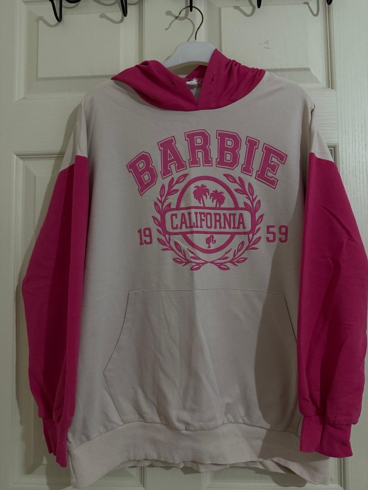 Bol kesim, uzun kollu, kapüşonlu ve düğmeli tasarıma sahip sweatshirt. Pembe ve gri renklerde, önünde Barbie California baskısı bulunur.
