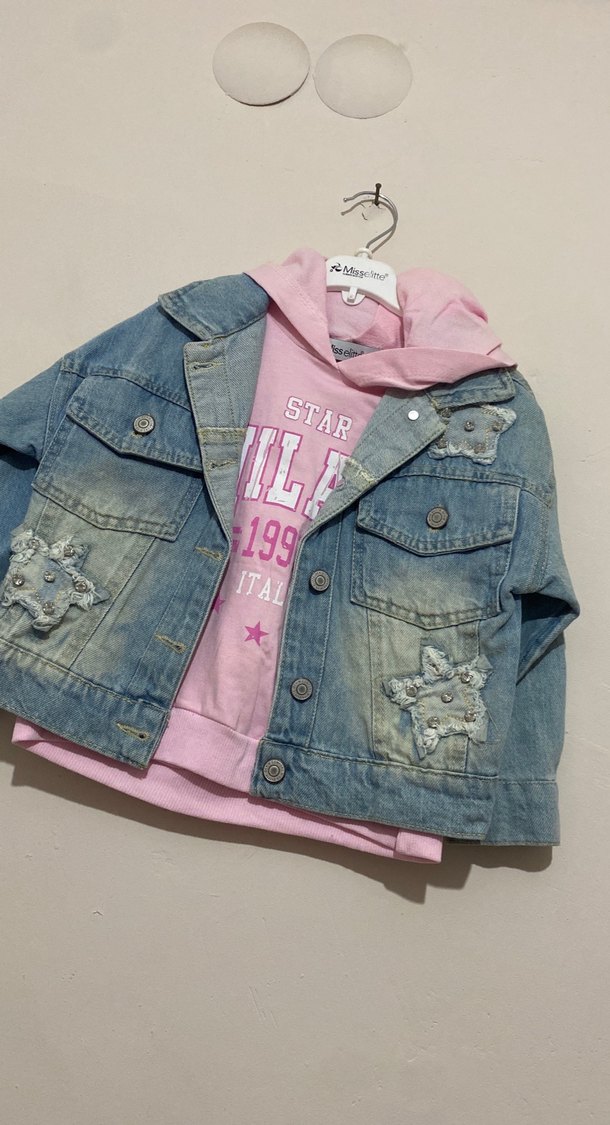 Baskılı pembe kapüşonlu sweatshirt ve düğmeli, yıldız detaylı kot ceket. Rahat ve salaş kesim, sokak modası tarzında. Kız çocuk takım 8 yaş da mevcut