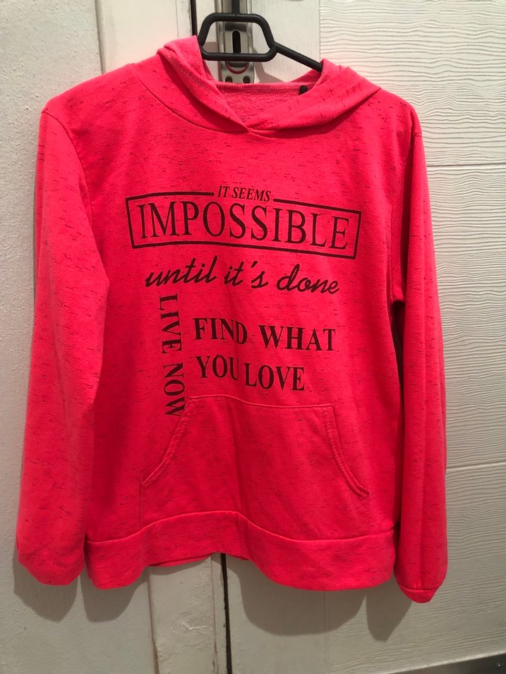 Pembe kapüşonlu sweatshirt, uzun kollu ve bol kesimdir. Yumuşak, sıcak kumaştan üretilmiş olup, baskılı motivasyonel yazılar içerir. Ön cepli ve günlük kullanım için uygundur.