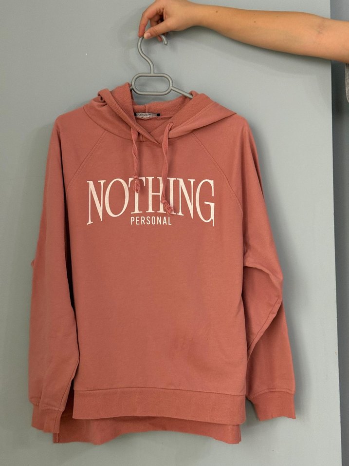 Bol kesim, uzun kollu ve bisiklet yaka pembe sweatshirt. "PERSONAL, NOTHING" baskılı, yumuşak sentetik kumaştan, günlük kullanım için uygun.