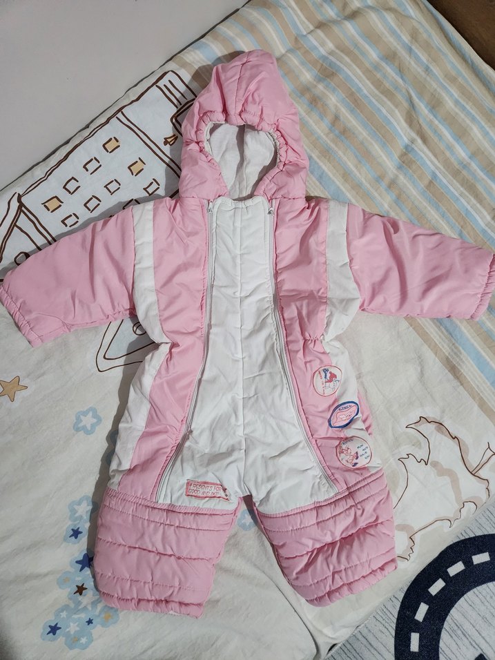 Pastel pembe renkli, kapüşonlu ve fermuarlı bebek kayak tulumu. Nakış detayları ve kesik yaka tasarımı bulunur. Soğuk havalar için yumuşak ve sıcak tutar ❄️.