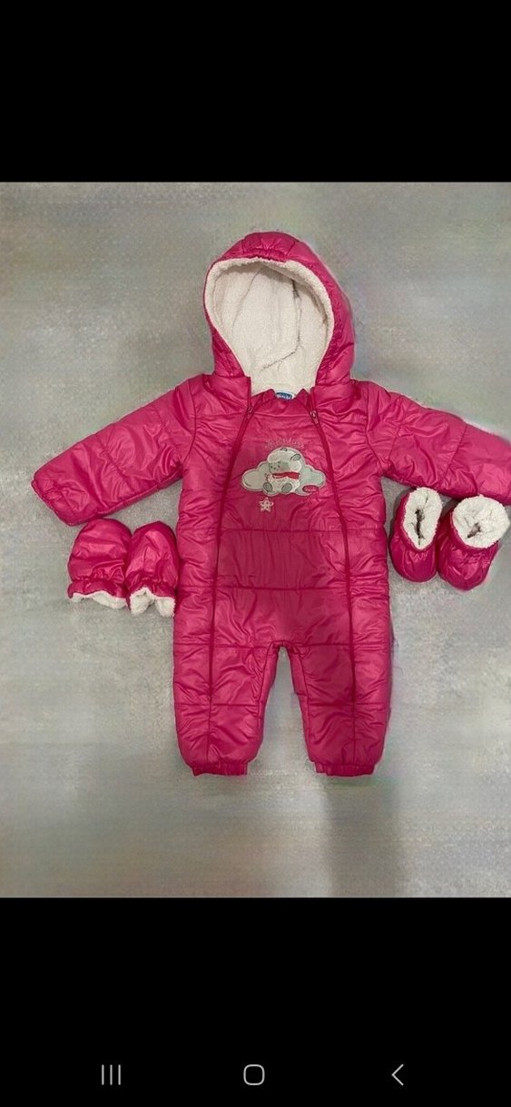 Pembe kapüşonlu bebek kış tulumu, kürklü iç detay ve renkli nakışlı desenlere sahip, eldiven ve bot seti ile birlikte.