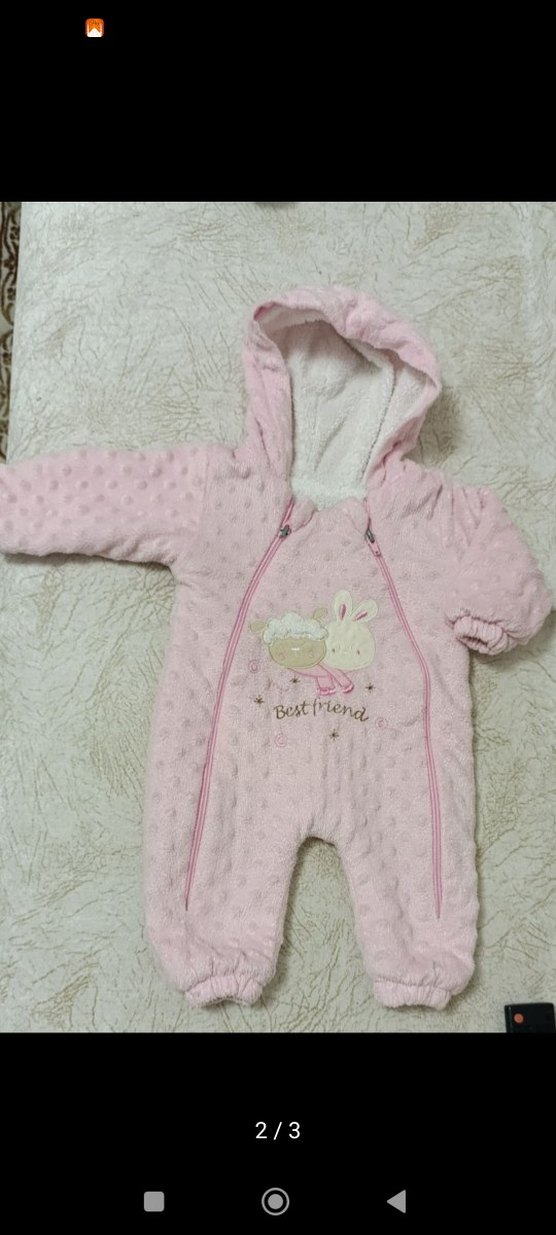 Pembe pastel renkte, kapüşonlu bebek tulumu. Nakışlı "Best friend" deseni ve çift ön fermuarlarıyla kolay giyilir. ❄️