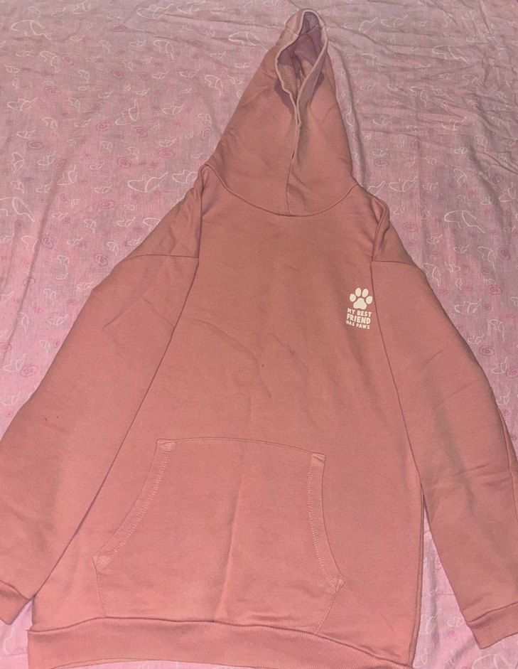 Pembe kapüşonlu sweatshirt, uzun kollu ve bol kesimdir. Yumuşak ve sıcak kumaştan üretilmiş, göğüste baskılı detay ve ön cep bulunur. Ufak bir lekesi var