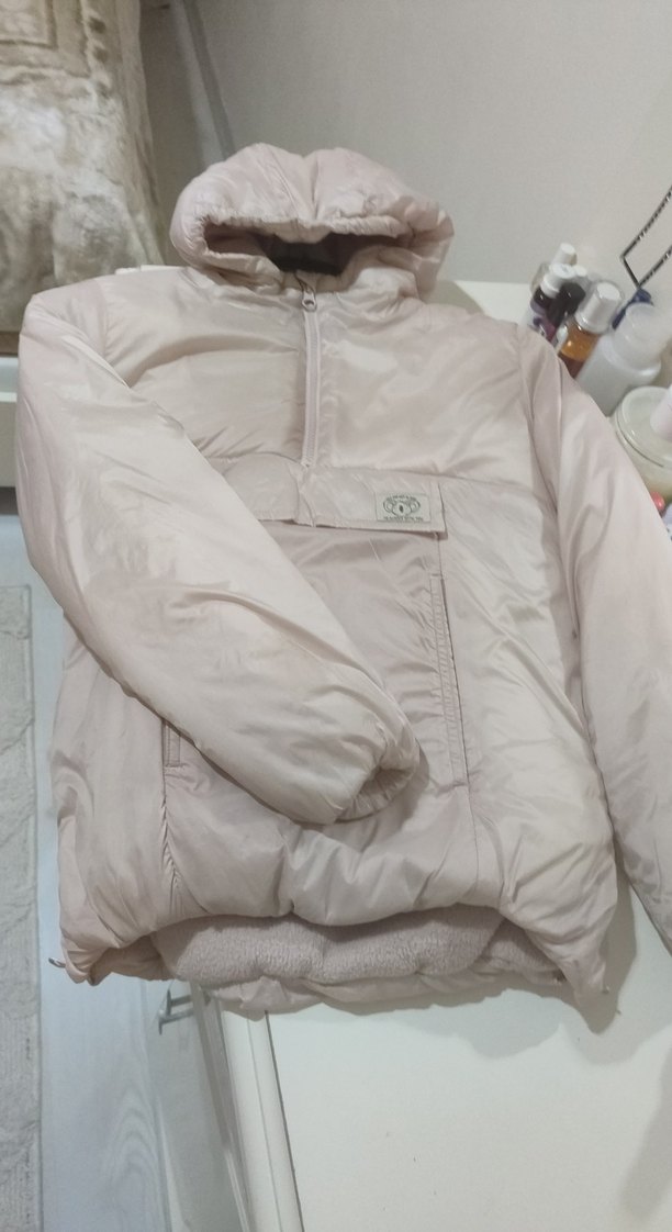 Pembe kapüşonlu, fermuarlı kız çocuk kış montu, rahat kesim ve uzun kolludur. Yumuşak ve sıcak kumaştan yapılmış, normal boyda, günlük sokak stili için uygundur.