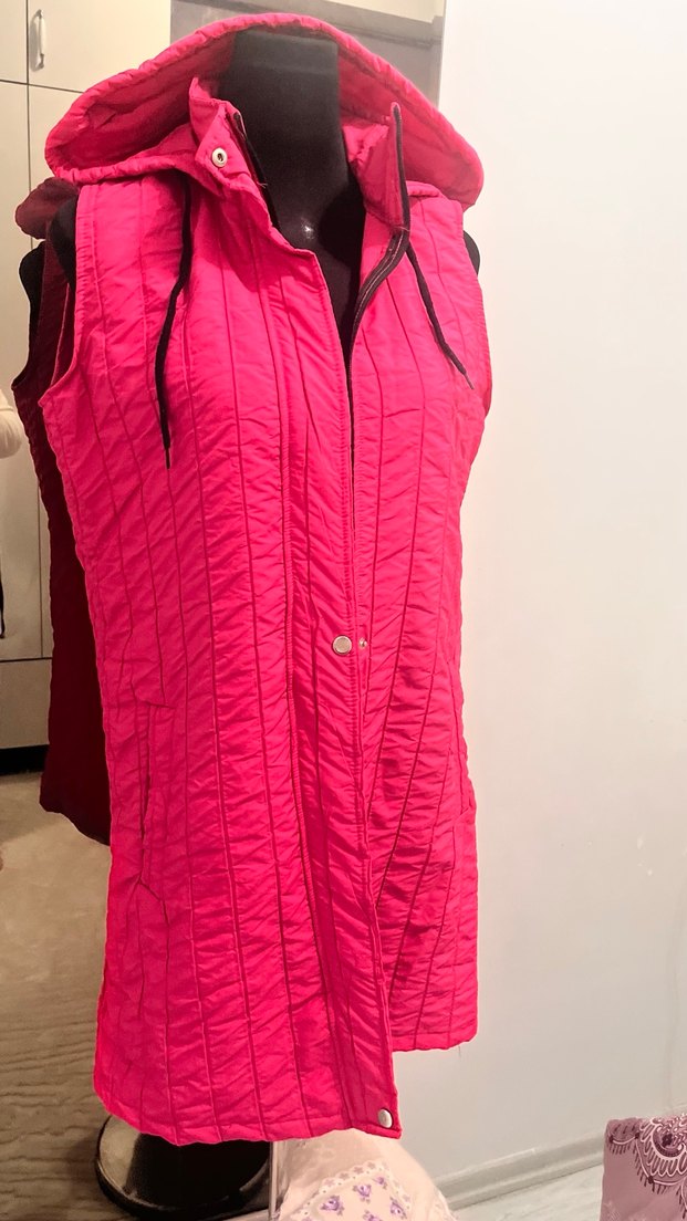Fermuarlı ve kapüşonlu, pembe renkli, yumuşak ve sıcak kumaştan yapılmış, yüksek yakalı, dar kesim kadın yelek. Renkli ve sokak modasına uygun, günlük kullanım için ideal.