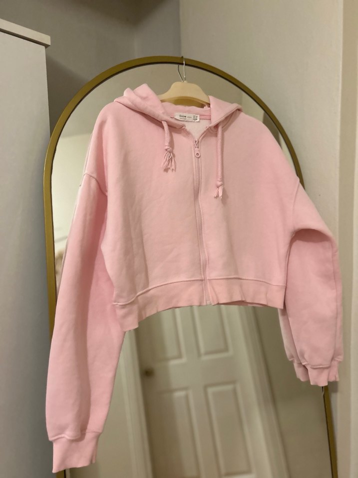 Pastel pembe kapüşonlu sweatshirt, fermuarlı ve kısa kesim. Uzun kollu, bol ve yumuşak dokulu kumaştan, gündelik sokak stili için uygun.