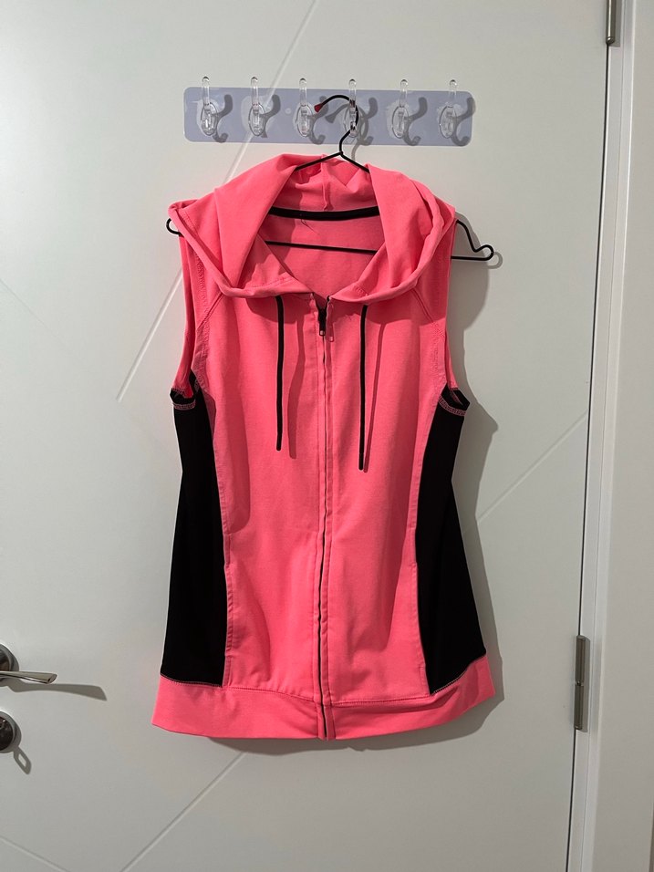 Pembe, kapüşonlu ve fermuarlı, kolsuz spor yelek. Siyah yan panellerle detaylandırılmış, sentetik kumaştan yapılmıştır. Rahat ve şık bir görünüm sunar. ♀️boy 64cm göğüs 84cm bel 82cm