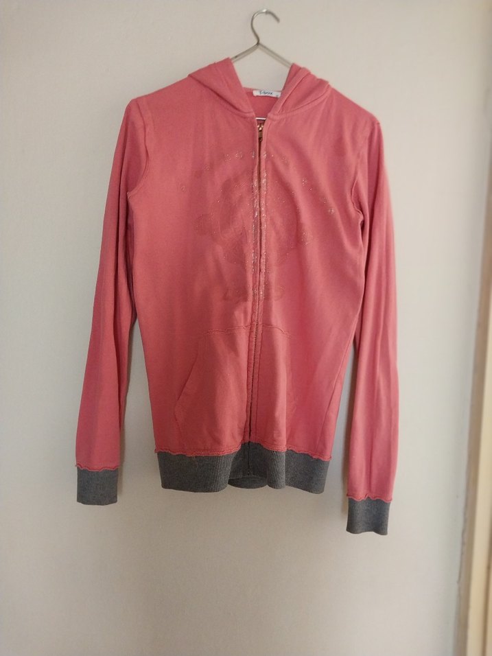 Pembe renkli, uzun kollu, fermuarlı ve kapüşonlu sweatshirt. Gri renkli manşet ve etek ucu detaylarına sahip, dar kesim ve günlük kullanım için uygun.