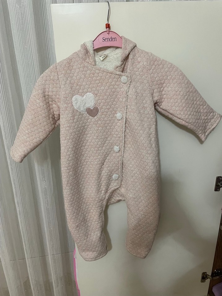 Pastel pembe kapüşonlu içi tüylü bebek tulumu, düğmeli ve nakışlı kalp desenli. Yumuşak, sıcak ve kapitone dokulu. Sadece iki kez aşıya giderken giydirdim