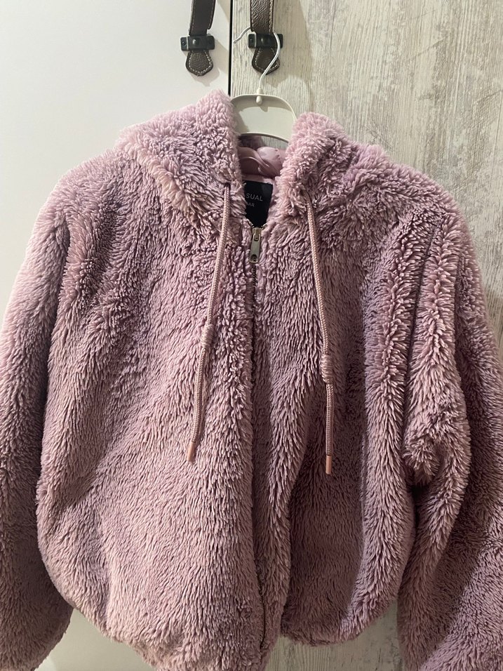 Yumuşak ve sıcak peluş kumaştan yapılmış, pembe kapüşonlu bol kesim ceket. Uzun kollu, normal midi boyda, rahat sokak stili için uygun.