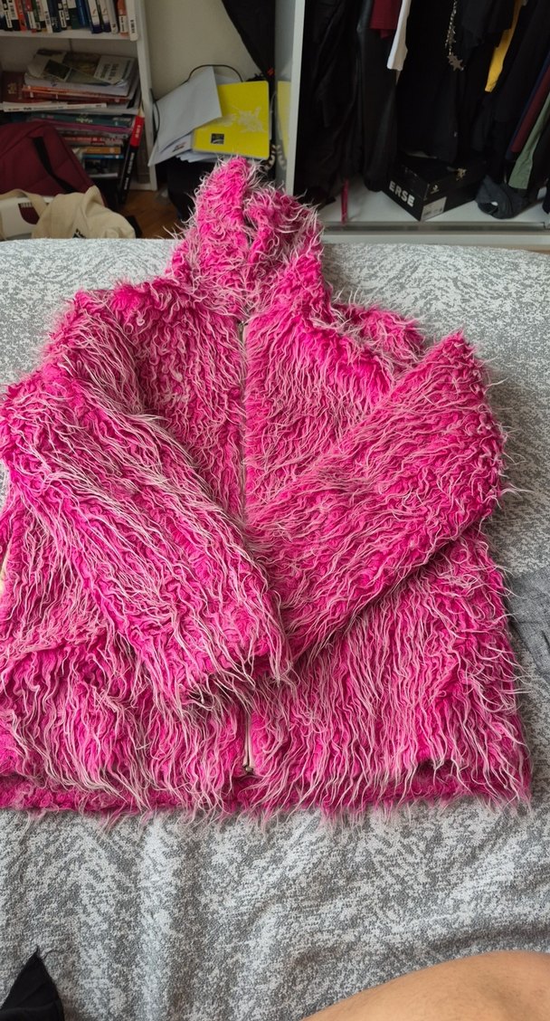 Pembe suni kürk detaylı, kapüşonlu ve uzun kollu bu kadın ceketi, midi boyda ve fitted kesimdir. Rahat ve renkli tasarımıyla günlük kullanıma uygundur.