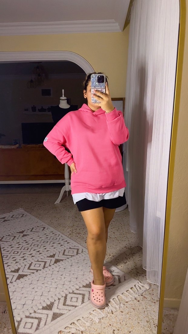 Pembe renkli kadın sweatshirt, bol kesim, uzun kollu ve yuvarlak yakalıdır. Yumuşak ve sıcak kumaştan üretilmiş, rahat sokak stili ve zahmetsiz şıklık sunar. Günlük kullanım için uygundur.