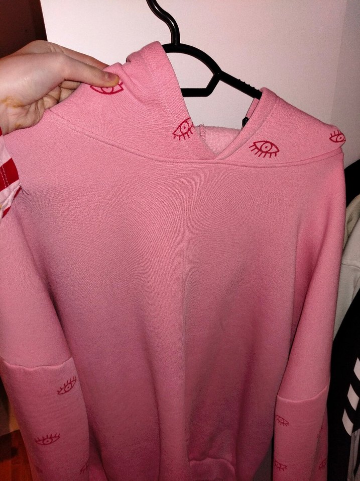Pembe tonlarda, uzun kollu ve kapüşonlu kadın sweatshirtü, rahat kesimi ve örgü dokusuyla sokak stiline uygun, göz desenli baskılı tasarım.